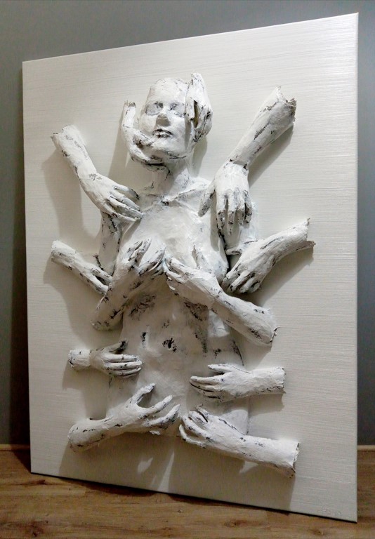 My name is Gaya Lastovjak and I am a contemporary figurative artist creating three-dimensional paintings with my own technique using paper-mache, canvas and oil paint. I was born in Lithuania but spent most of my life in Poland. I am a self-taught artist with a master’s degree in art history. As a person I value peace, but on the other hand I worrie too much about everything, so I look for calm in books, mainly classics of world literature (my grandmother was a teacher and she instilled in me a love of books). My parents, who are musicians, made me a music lover, I value and respect family as well as traditions. I like both classical and contemporary art, love going to museums and admiring the beauty that human hands can create. Developing is important to me, looking for new sources of inspiration, expanding knowledge and simply be a better person.