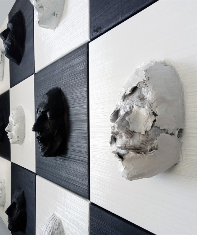 My first three-dimensional white painting was created in 2007, but I was looking for this form much earlier, still in high school. After much searching, I decided that I like the sculpture the most, but also the structure of the oil paint. Knowing the classic techniques of sculpture – plaster, clay, wood, metal – all these types were too heavy and needed a separate studio, and I didn’t have the conditions for it, not to mention ceramics. We had paper-mache classes and I really liked this light and plastic, though not easy material. It requires a lot of patience and time, but it was also incredibly calming for me. I’ve been perfecting my technique for many years, so please forgive me if I don’t give you a recipe for it, it’s my little secret. All I can say is that creating one painting requires a lot of work and is very time-consuming, a larger format sometimes takes several months, so paintings are created in parallel. The artwork titled “Game” stood the longest. It is a never-ending painting, with new faces appearing from time to time. The previous version with dimensions of 360x160x6 cm was created for several years (because I was still creating as a hobby), the latest version with dimensions of 280x120x6 cm took me about eight months.