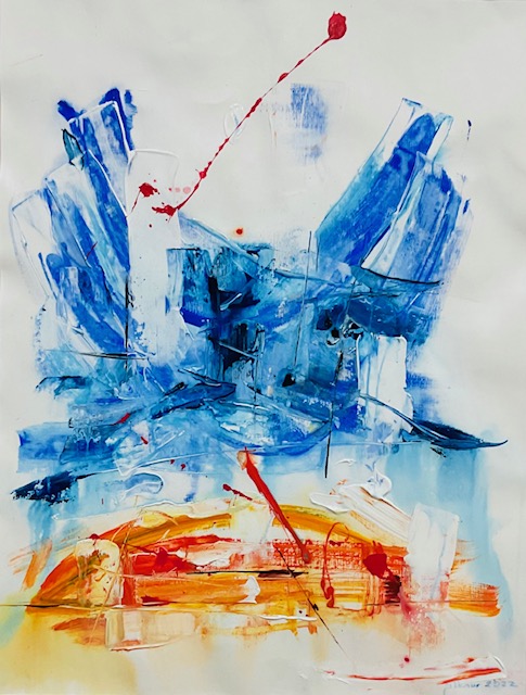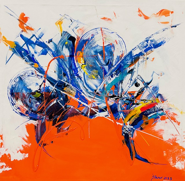 At the beginning, I was influenced by impressionists, but at the meantime I continue with abstract works. I abstract objects by constructing them with my own perception.  Following my inner insights I tend to work with blue and orange pair. I may use different techniques and colors as well, but at the end of the day I always return to the orange and blue.  Acting outside the traditional rules, helps reflect my emotions. I allow myself to express freely and this offers me a wide playground from the way I use the material to the composition I construct. Subjectivity also brings visibility. For example, one can percept sadness in the “Talking heads” I make.